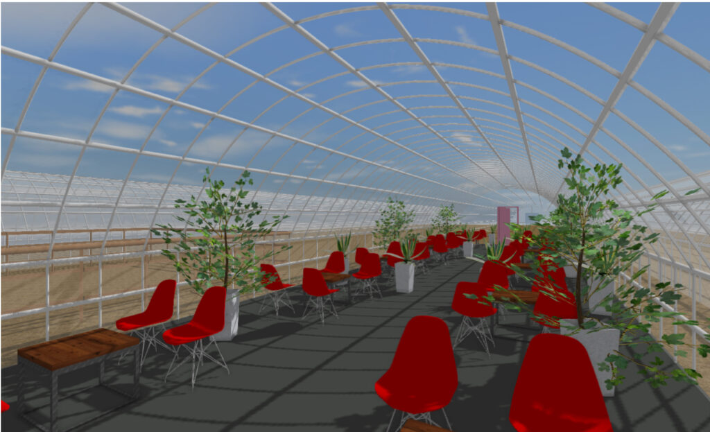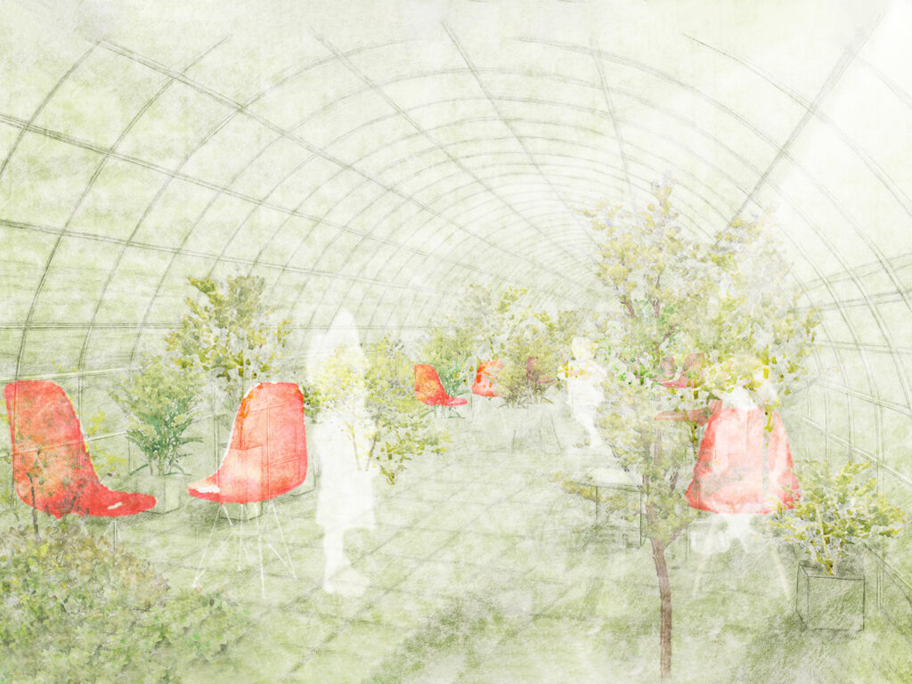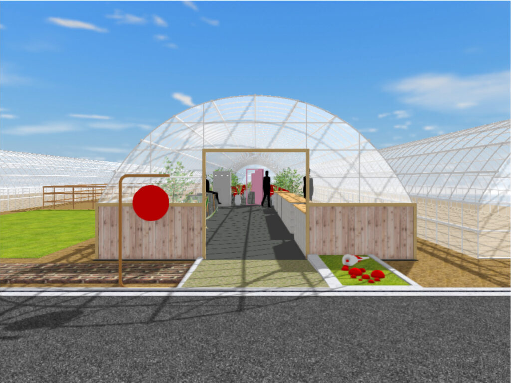 いちご農家の「作物への愛情」をデザインコンセプトに据え、観光農園の中核となるロビー空間を創出しました。いちご畑を想起させる空間演出を通じて、体験型観光農園として来訪者を非日常の世界へ誘う仕掛けを随所に配置しています。ビニルハウスという半外部空間の特性—内部と外部の境界が曖昧である性質—を活かし、空間を緩やかに分節させながら外部環境へと自然に連続させました。