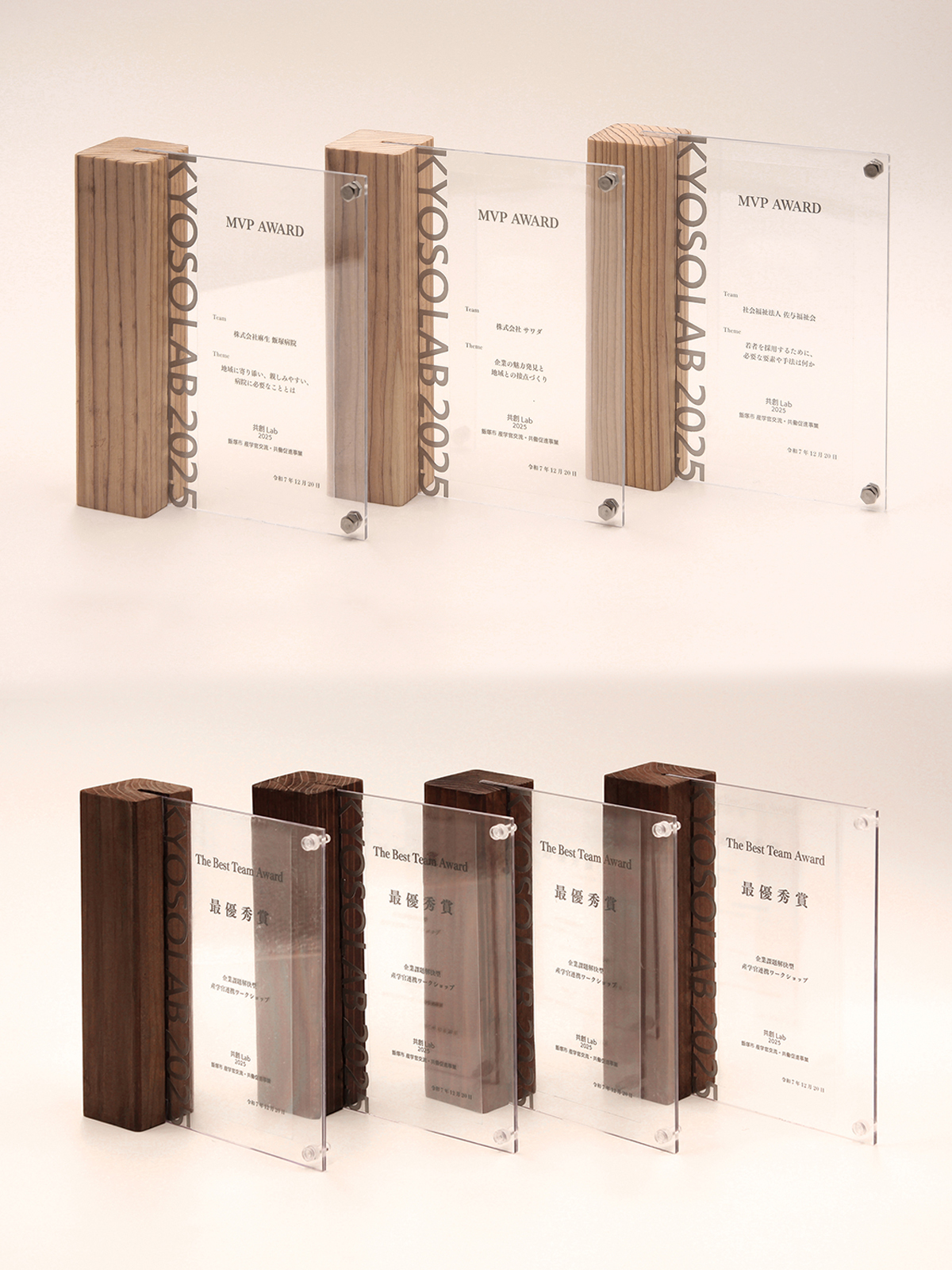 飯塚市産学官交流・共働促進事業(通称:共創Lab)の各グループMVP及び最優秀賞に授与されたトロフィー。